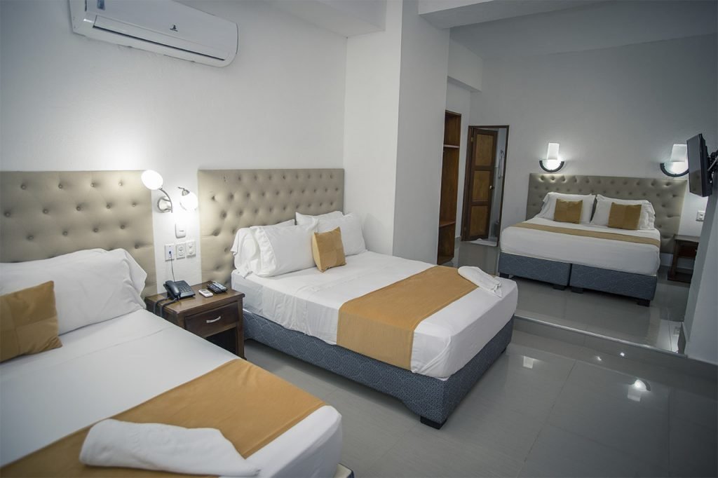 FAMILIAR Descripción: Esta habitación cuenta con 3 camas dobles, perfecta para grandes familias o grupos. RESERVA ESTA HABITACIÓN SERVICIOS CON LOS QUE CUENTA LA HABITACIÓN Tv por cable Aire acondicionado Cajilla de seguridad Amenites Baño privado Ducha de agua caliente Servicio de plancha Secador GALERÍA